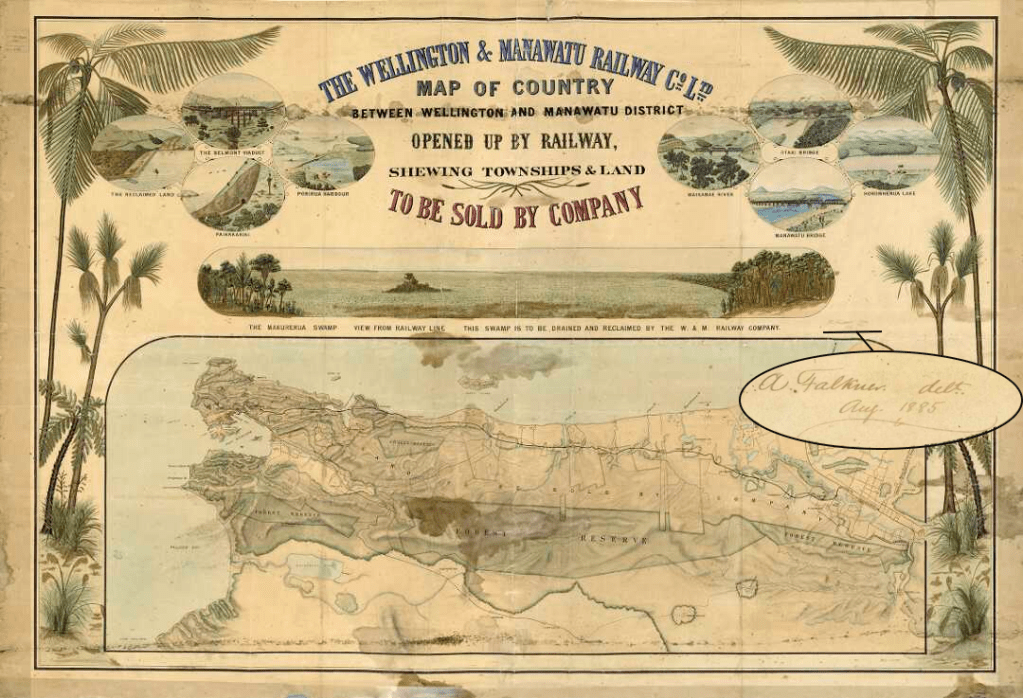 He was also a bit of an intrepid explorer. As part of his work for the Wellington and Manawatu Railway Company, in company with two other officers, he trekked from Shannon to Putara. At this time the country was charted as unknown on the survey maps. The party left with one day’s rations, thinking the trip would be a comparatively easy one. The trip actually took two full days. Until they reached the Mangahao the going was comparatively easy, but from there the travelling was most difficult, with high ridges and leatherwood scrub, which was almost impassable. So close was the mat that a bulldog with the party had to be carried. Finally they reached the Mangatainoka and after some travelling struck a whare, later coming on into Eketahuna.