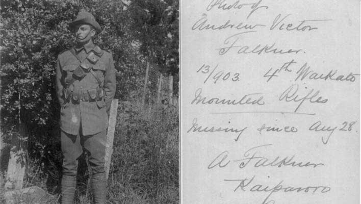 In 1914, war broke out. Alfred’s son Victor Andrew Falkner enlisted that December, aged 21. Victor had attended Kaiparoro School, worked in his father’s mill and briefly worked as a farmhand at Opotiki. He was killed at Gallipoli within a year; his body never found. Alfred’s nephew and Victor’s cousin Donald Pallant’s parents lived at Kaiparoro also, but he went to Palmerston North Boys’ High School before becoming a teacher in Wellington and enslisting a few months before Victor. He was also never found.