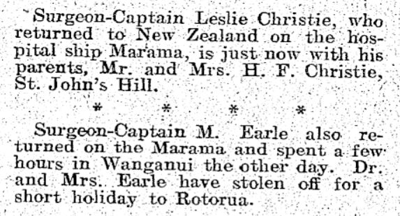 Maurice had a quick turnaround back in New Zealand. The Whanganui papers reported on March 16: “Surgeon-Captain Maurice M. Earle has completed his first round on the Marama and is spending a few days at home with his family. The doctor, who is looking well although a trifle thin, is glad to be back in New Zealand, which, he says, is looking very beautiful to him.” – Wanganui in Wisps. Free Lance, Vol XVI, Iss 871, p. 9, Papers Past. By March 22, he had departed on the Marama’s second sailing.