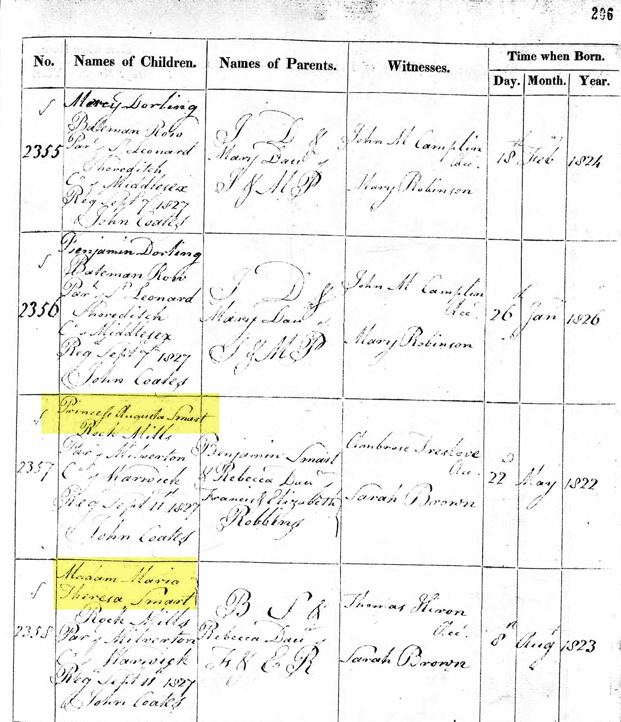 While researching the Smart family (Dad’s paternal side of the tree – Thomas Clark Smart (1761-1843) was my fifth great-grandfather, grandfather of Thomas Mason, of Mason’s Gardens in Taita, Lower Hutt), I came across a set of siblings who had been given some rather unique names. Thomas Clark Smart’s brother and business partner Benjamin Smart Jr rented the premises of their father Benjamin Sr’s hugely successful cotton-spinning enterprise in Rock Mills, Warwickshire, from 1797, turning it into a dual-purpose venture for corn and cotton.