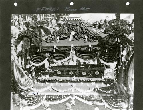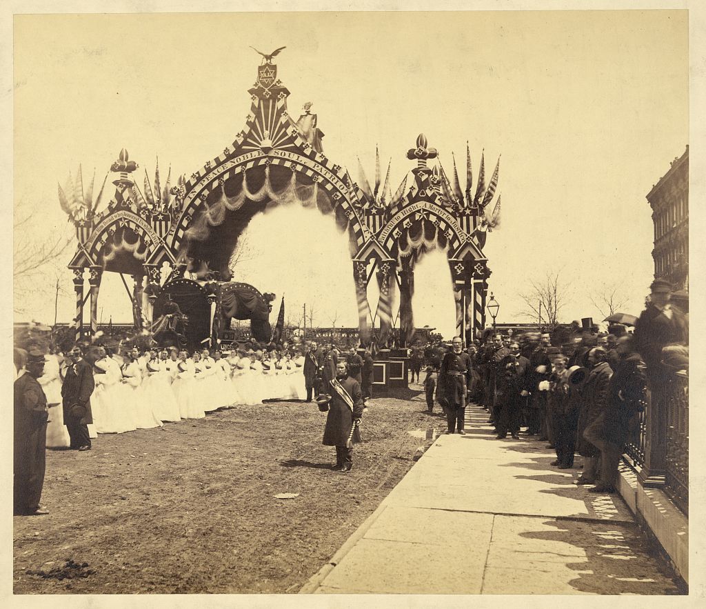 Slowly at Twelfth Street and Michigan Avenue the funeral train came to a stop. Under a huge reception arch of side arches, columns, and Gothic windows in the lake shore park near by, the eight sergeants carried the coffin and laid it on a dais. The pallbearers and guard of honor made their formation around it. Throughout brasses and drums gave a march written for the occasion, ‘The Lincoln Requiem.’