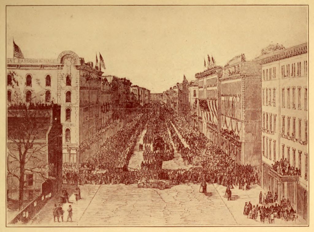 …The coffin was then placed in the funeral car or hearse, prepared expressly for the occasion, and the funeral cortege passed out of the Park Place into Michigan avenue, and fell into procession… It was a wilderness of banners and flags, with their mottoes and inscriptions. The estimated number of persons in line was thirty-seven thousand, and there were three times as many more who witnessed the procession by crowding into the streets bordering on the line of march, making about one hundred and fifty thousand who were on the streets of Chicago that day, to add their tribute of respect to the memory of Abraham Lincoln.