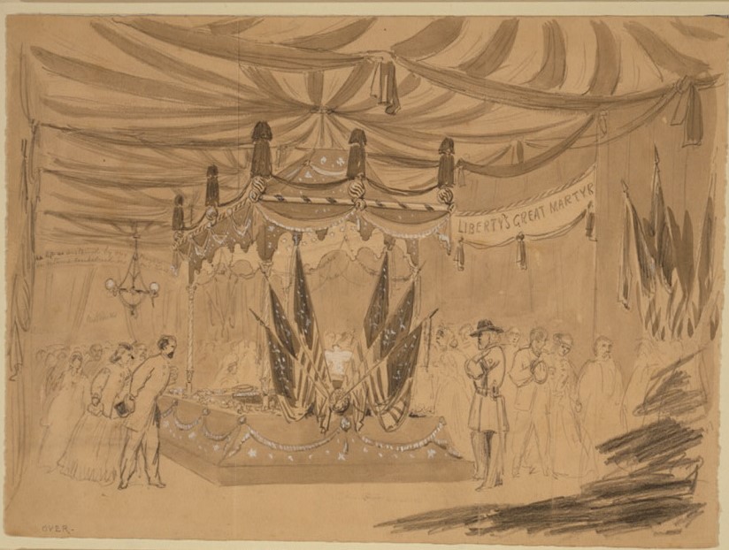 Lincoln’s body lay in state until 8pm at City Hall, Chicago. Civil War artist correspondent, William Waud described it as such: “The ceiling is draped black & white. The walls draped in folds all black with flag trophies at certain distances. The Catafalque is covered with black cloth & velvet all black with silver fringe & stars. Inside of d[itt]o & the pillars white with the exception of the ceiling inside the canopy which is black with white stars cut out through which the light is admitted to fall on the coffin.”