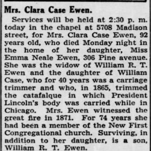 Clara Case Ewen, obituary, Chicago Tribune (Chicago, Illinois) 15 Jul 1942, p.16