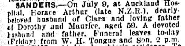 Dick became a carpenter in New Zealand. I imagine he relished the thought of being able to work outdoors after life in the steel factories of Sheffield. He brought his love of football to New Zealand and played for Mt Albert F.C. Eight years after his arrival in Auckland, he married a local girl, Clara Grace Ingham. They went on to have two children: Dorothy Grace Sanders (1914–2006) and Maurice Arthur Sanders (1916–1973).