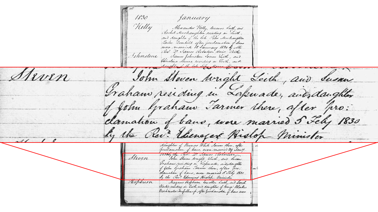 John Steven’s marriage to Susan Graham, a Lasswade farmer’s daughter, in 1830 in South Leith, provided no clues as to his parents.