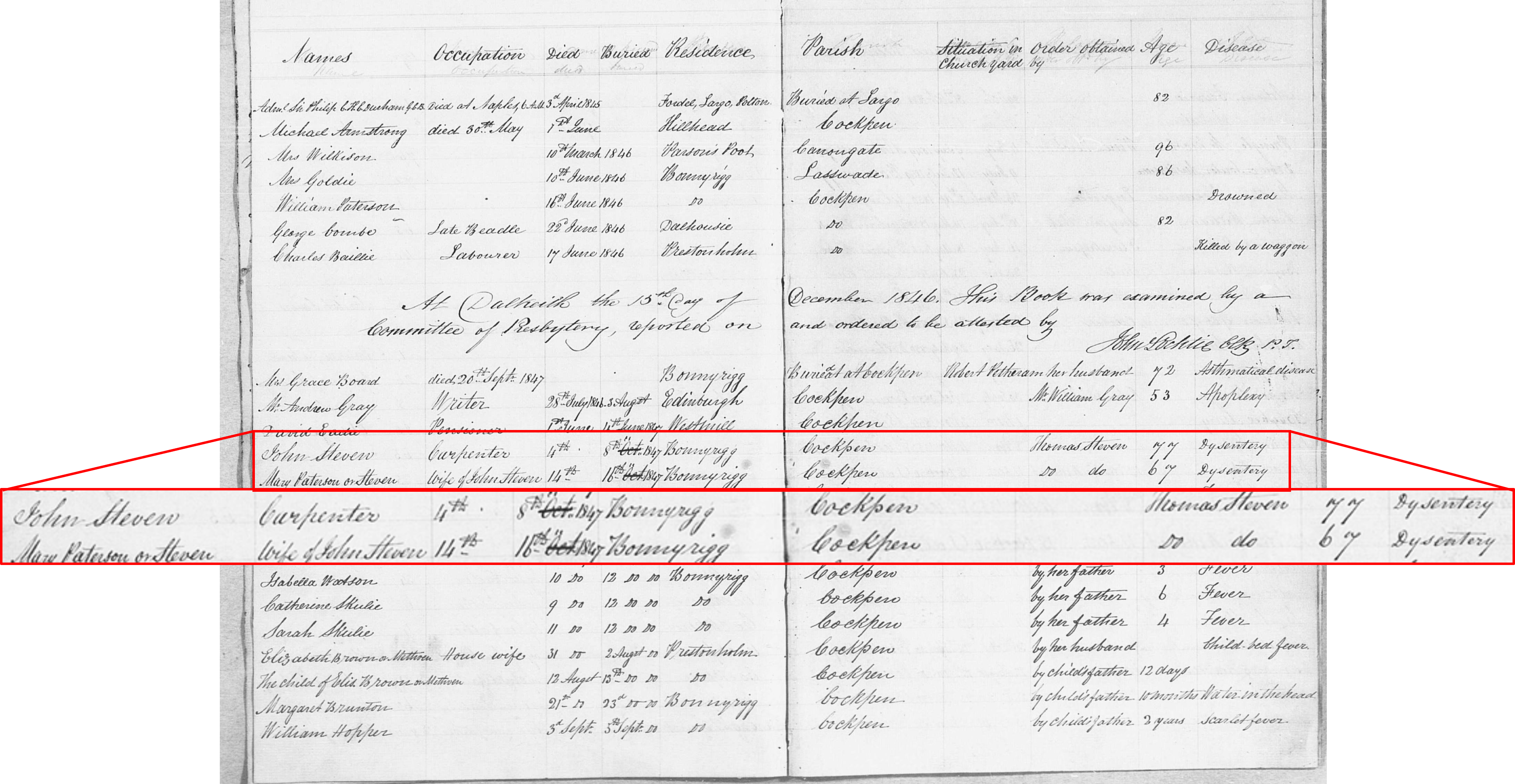 Both John and his wife Mary Paterson were missing from the 1851 Census. It transpired that both had died within days of one another of dysentery in 1847 and were buried in the Cockpen and Carrington Parish Churchyard. Thomas Steven, their eldest son, was the informant for both their deaths.