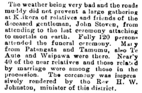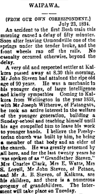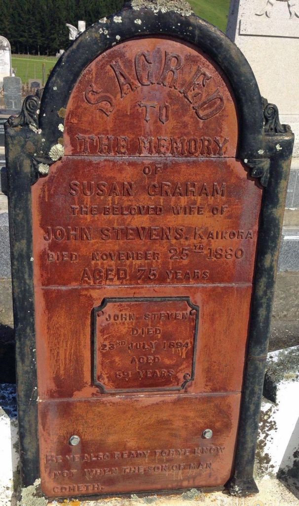 John Steven, son of John Steven and Mary Paterson is buried with his wife Susan Graham at Kaikora North Cemetery in the Hawke’s Bay. The cemetery closed in 1903. Their headstone (complete with two different spellings of Steven and an incorrect death month for Susan!) has been relocated to Ōtāne Cemetery.