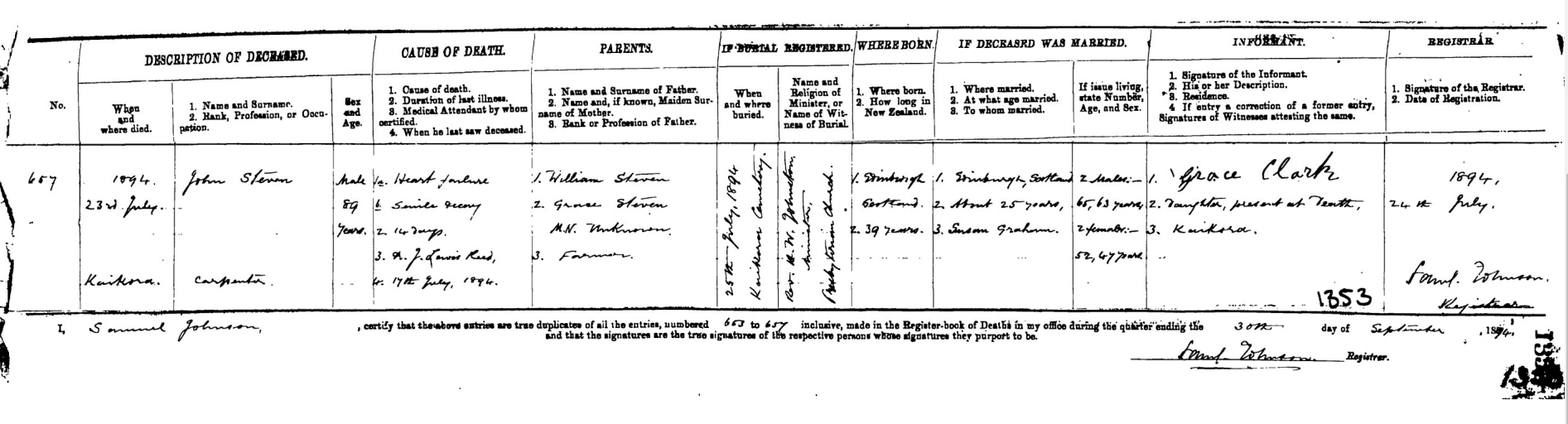 Further research proved that George Steven was the brother20 of John Steven (of Bonnyrigg, father of John Steven who came to Kaikora) and brother-in-law to Mary Paterson. They WERE related to John Steven after all – albeit his Uncle and Aunt, not his parents!