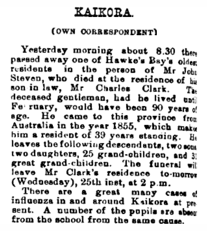 Born in 1805, John Steven Sr died in Kaikora, Hawke’s Bay in 1894. His wife Susan (Graham) Steven died some fourteen years previously, in 1880.6 John Sr left shares and money to his daughter, son-in-law and granddaughter Anne Mein, Edward and Susan Watts, five pounds sterling to son-in-law Samuel Lozell, the same amount each to granddaughters (daughters of Samuel Lozell) Susan Horne, Mary Grace Mudgway, Sarah Ann McKain and Alice Lozell, five pounds to daughter-in-law and son Mary and John Steven Jr, ten pounds to daughter-in-law and son Alice and Alexander Beaufies Steven, five pounds to granddaughter Flora Holland (daughter of Alexander B Steven), forty pounds to daughter Grace Clark, ten pounds to granddaughter Susan Clark and twenty pounds to son-in-law Charles Clark. He devised all his land “situate at Kaikora being portion of block numbered fifty on the plan of the Patangata District with all messuages and buildings thereon (being the premises whereupon I am now residing)” to John Steven Jr and son-in-law Charles Clark upon trust for his daughter Grace Clark, “her heirs and assigns absolutely.” In addition, grandson John Steven Lozell was granted “the said parcel of land…situate on the southwest of the Kaikora Bridge, his heirs and assigns forever.” The residue of the estate was granted to grandson John Clark.7
