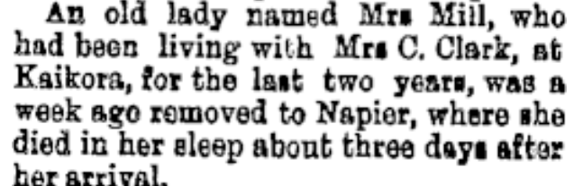 The ‘old lady’ it turned out, was Mary (Steven) Mill, the daughter of William Steven and Elizabeth Baillie Hutchinson, and niece of John Steven of Kaikora. Mary emigrated to New Zealand from Scotland after the death of her husband John Mill, bringing with her their son, David Steven Mill. Mrs C[harles] Clark was John Steven’s daughter Grace. Mary and she were first cousins, linking William and John definitively to one another and also to John Steven and Mary Paterson, their parents.
